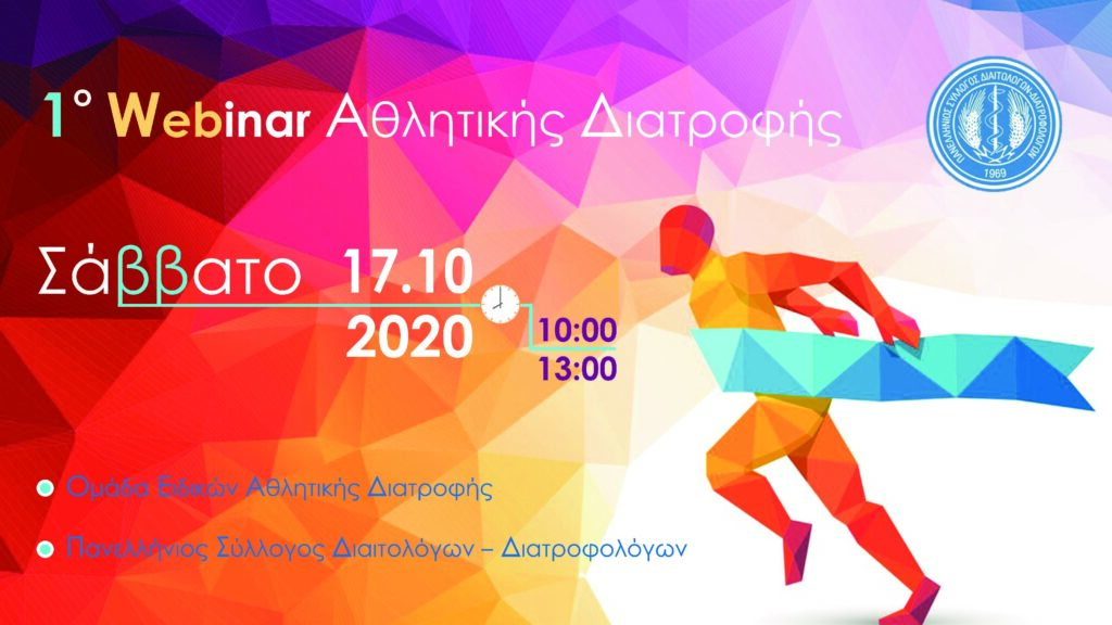 Είμαστε στην ευχάριστη θέση να σας ανακοινώσουμε ότι η Ομάδα Ειδικών Αθλητικής Διατροφής του Πανελλήνιου Συλλόγου Διαιτολόγων -Διατροφολόγων (ΠΣΔΔ) διοργανώνει το “1o Webinar Αθλητικής Διατροφής” το Σάββατο, 17 Οκτωβρίου 2020, 10:00 – 13:00.