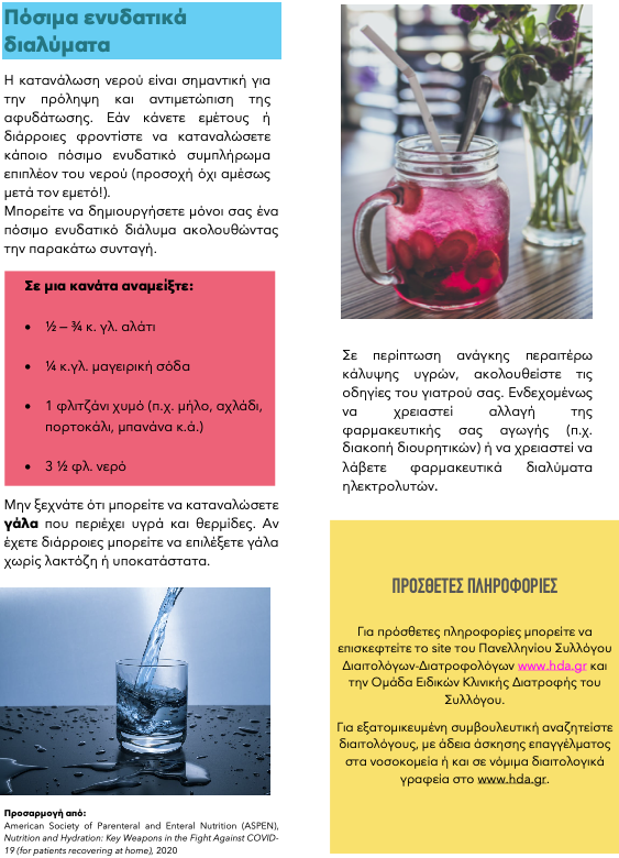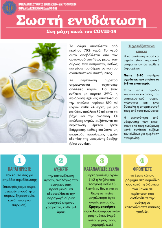 Τα μέλη της Ομάδας Ειδικών Κλινικής Διατροφής του Πανελλήνιου Συλλόγου Διαιτολόγων – Διατροφολόγων (http://www.hda.gr/omada-eidikon-klinikis-diatrofis/) μας ενημερώνουν για το ρόλο της ενυδάτωσης στην αντιμετώπιση της πάθηση covid-19 που προκαλεί ο νέος κορωνοϊός.